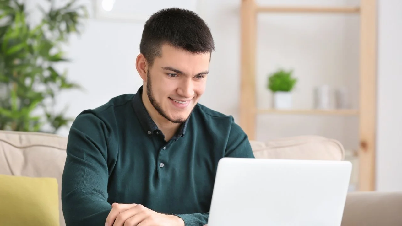 A young man with short dark hair and a beard is sitting on a beige couch, smiling as he looks at a white laptop in front of him. He is wearing a dark green button-up shirt. In the background, there is a wooden shelf with a small potted plant and some decorative items, and a green leafy plant to the left.
