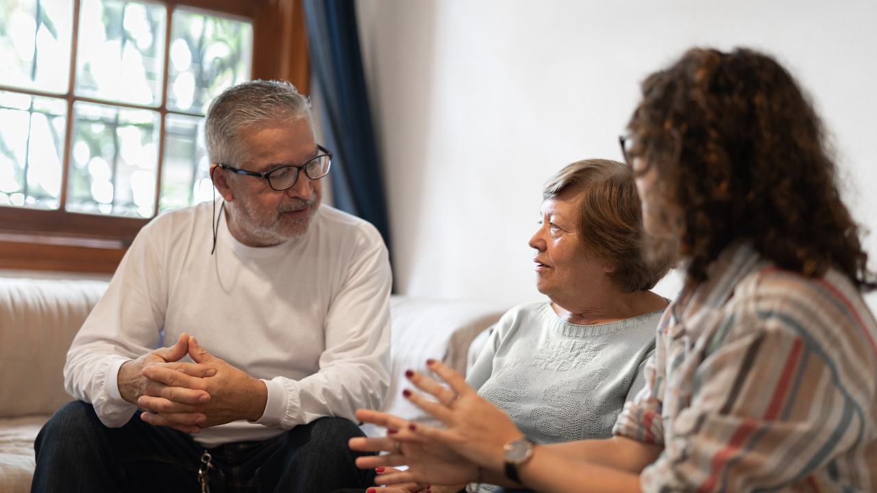 Three people sitting on a couch having a conversation, with a window in the background